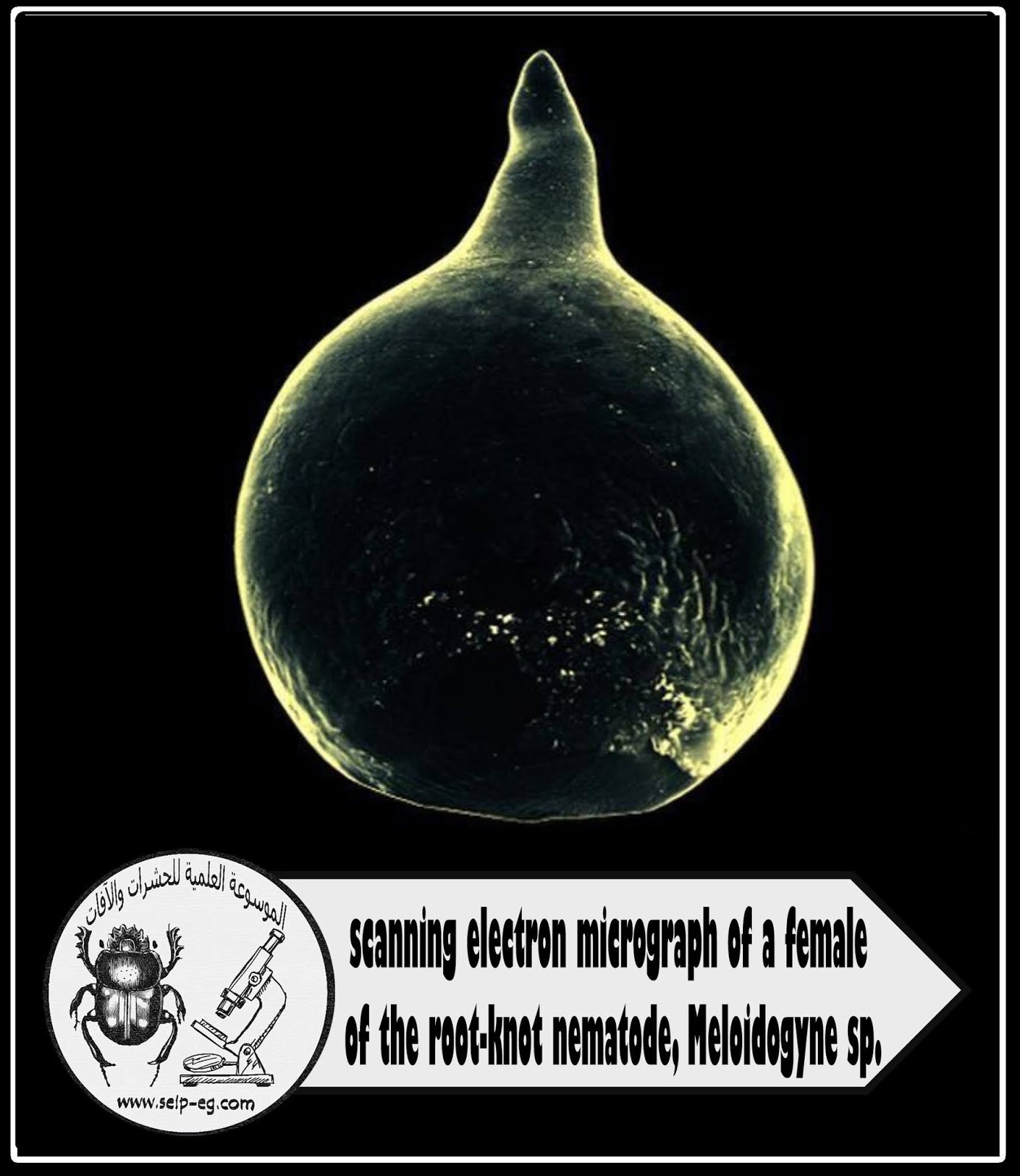 | أنثى نيماتودا تعقد الجذور Jonathan D. Eisenback, Virginia Polytechnic Institute and State University, Bugwood.org Description:scanning electron micrograph of a female of the root-knot nematode, Meloidogyne sp. |